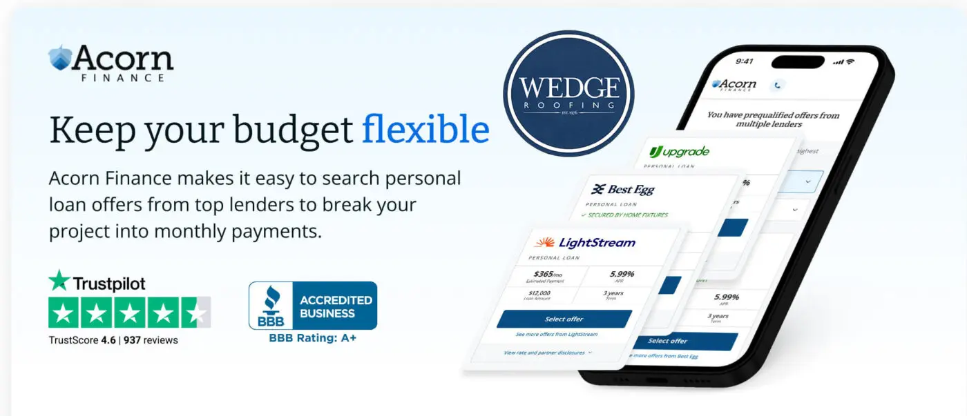 At Wedge Roofing, we understand that a new roof is one of the most important investments homeowners can make. Thatโs why weโve partnered with Acorn Finance to provide reliable roof financing plans that align with your budget and project timeline.