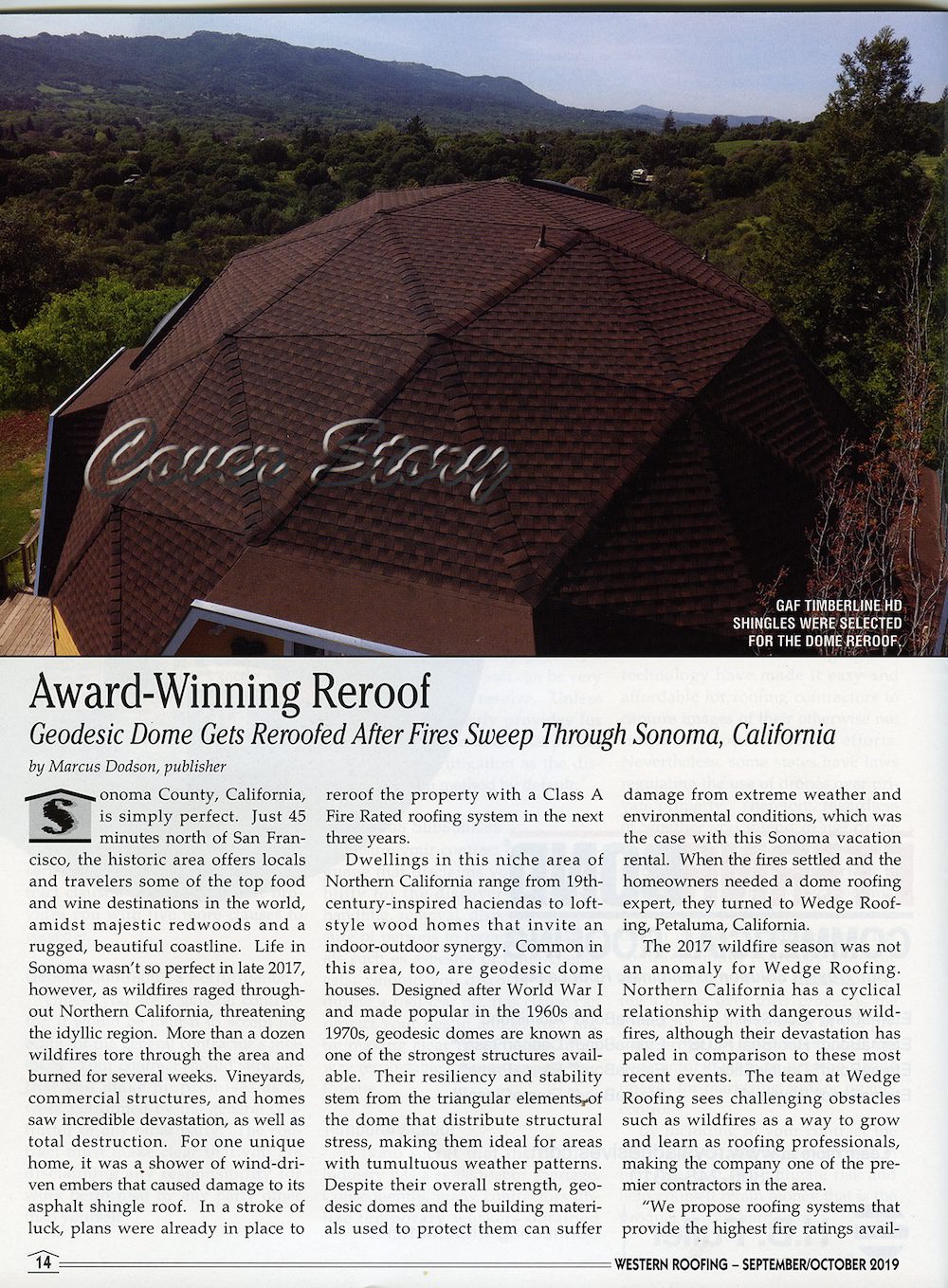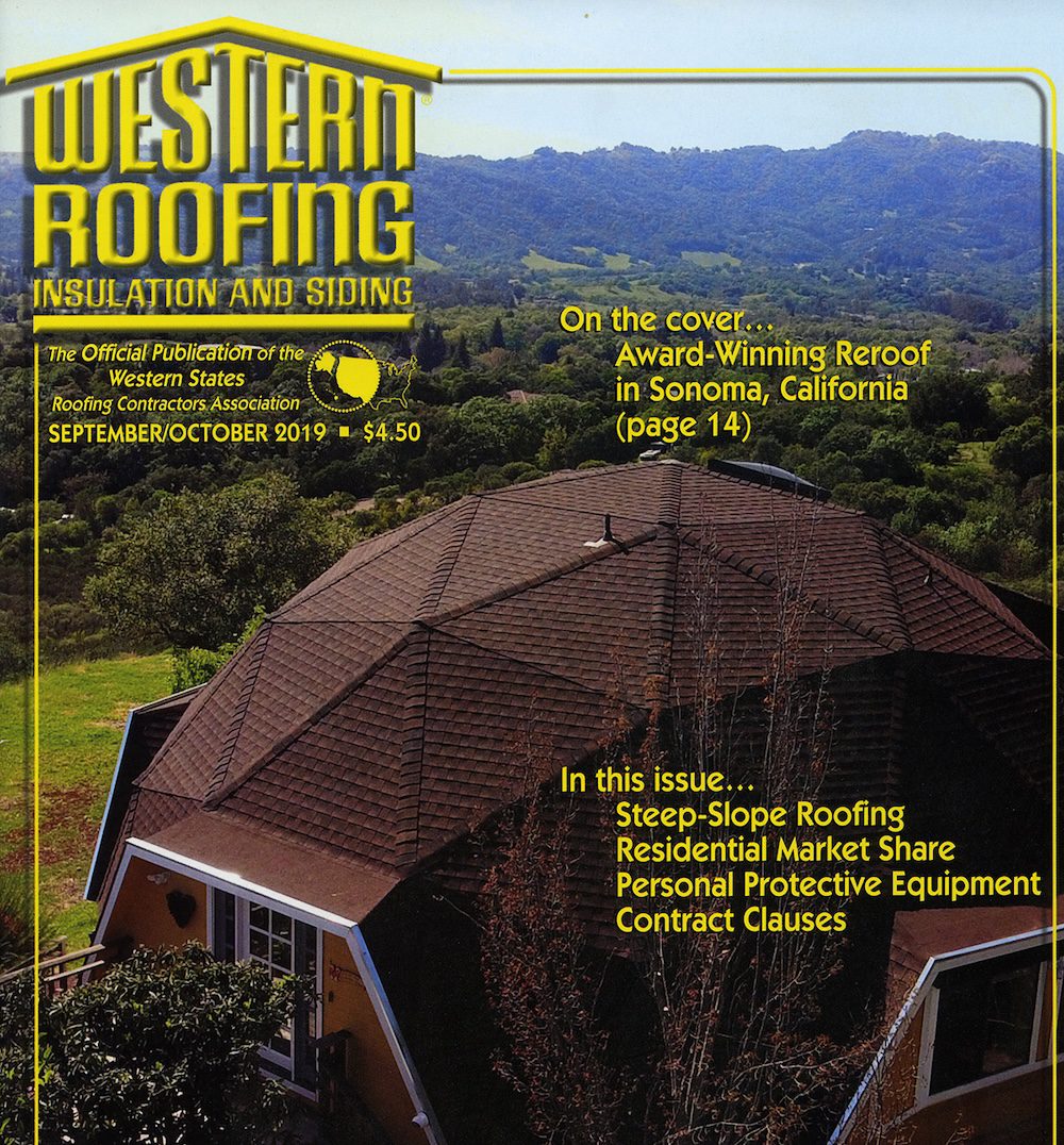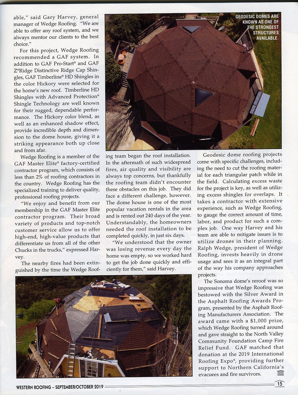 Wedge Roofing received the 2019 Excellence in Asphalt Roofing Silver Awardย from the Asphalt Roofing Manufacturers Association (ARMA) for the installation of a GAF Shingle Roof on a Geodesic Dome in Sonoma, CA. Read more about this award-winning geodesic dome roof.