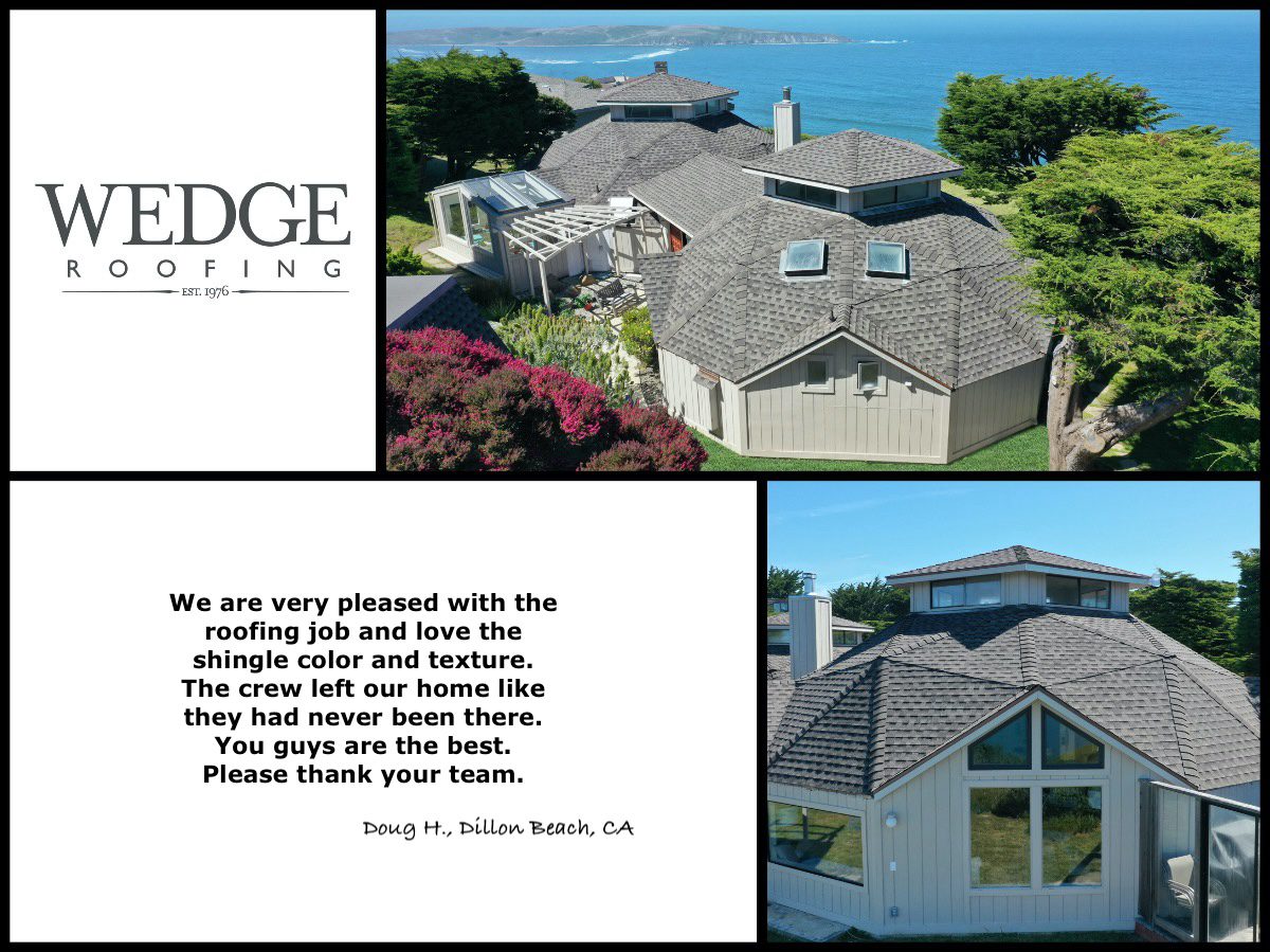 Client’s Roof Review: “We are very pleased with the roofing job and love the shingle color and texture. The crew left our home like they had never been there. You guys are the best. Please thank your team.” Doug H., Dillon Beach, CA