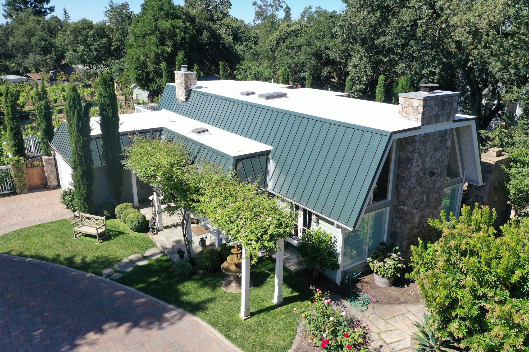 Installation of a Standing Seam Metal Roof system on the sloped sections of the building and spray foam on the flat roof at Azzaro Vineyards in Sonoma, CA. The Standing Seam Metal Roof panels are manufactured by ASC Building Products.