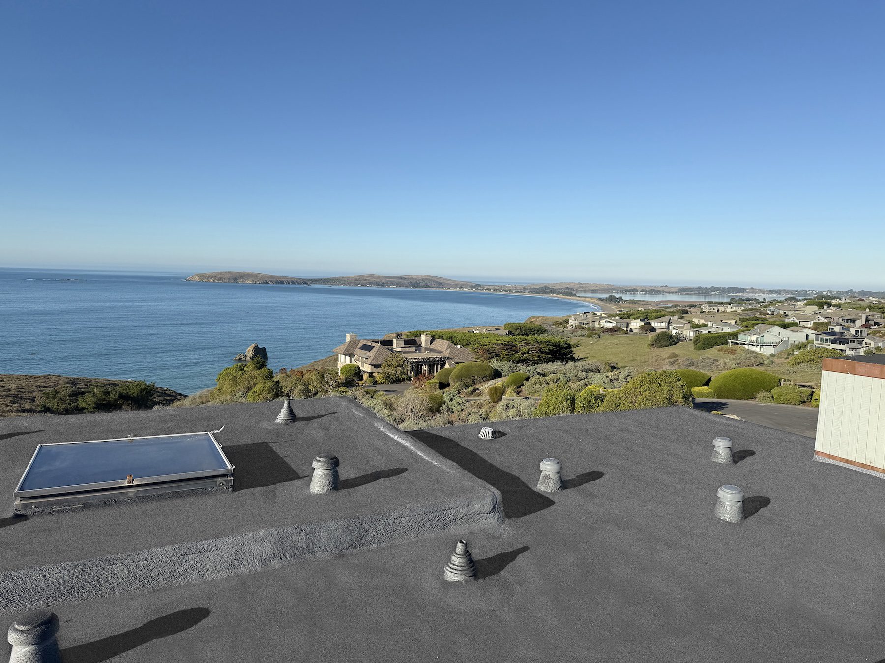 The expert team at Wedge Roofing applied a seamless layer of SPF foam, topped with a premium gray high-solid-content silicone coating. To ensure maximum durability and resistance to wear, double charcoal granules were added, creating a tough and visually appealing surface perfect for the demands of a coastal home in Bodega Bay.
