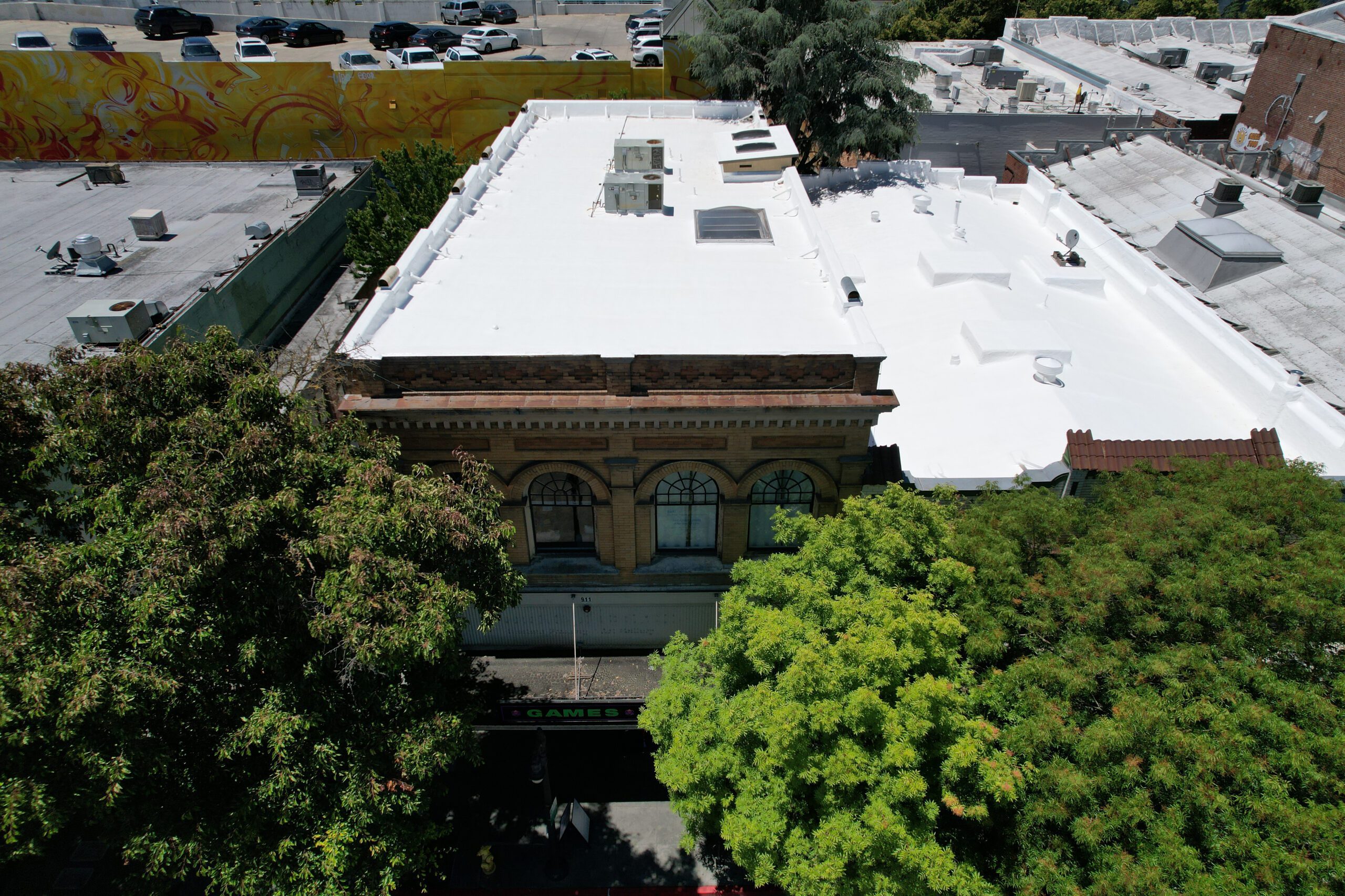 Sonoma County Historic Roofing: Wedge Roofing installed an insulating spray foam roof on this historic 1895 commercial building at 135-139 Kentucky Street Petaluma, California, designed in the Second Renaissance Revival style.