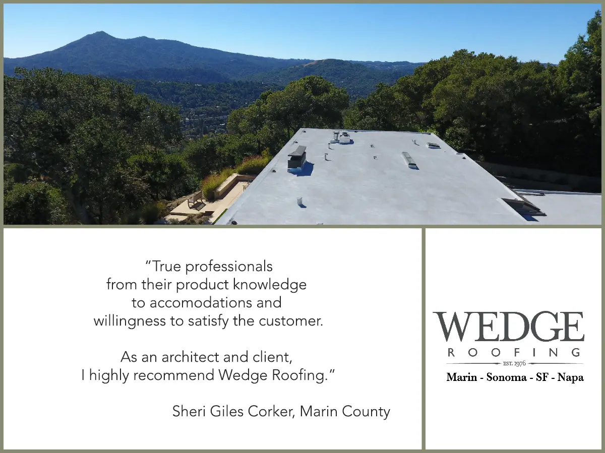 “Wedge Roofing is a true professional, from product knowledge to accommodations and willingness to satisfy the customer. As an architect and client, I highly recommend Wedge Roofing” Sheri Giles Corker, Marin County.