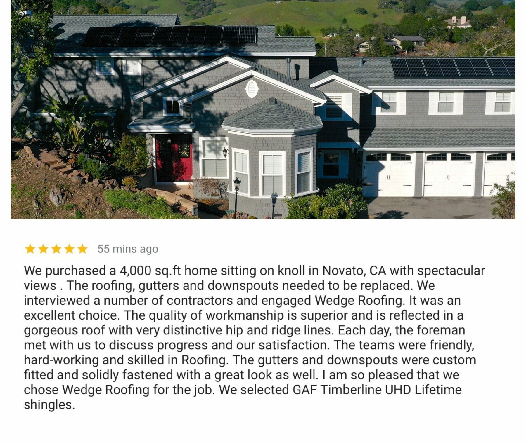 “We purchased a 4,000 square foot home sitting on a knoll in Novato, CA with spectacular views. The roofing, gutters, and downspouts needed to be replaced. We interviewed a number of contractors and engaged Wedge Roofing. It was an excellent choice. The quality of workmanship is superior and is reflected in a gorgeous roof with very distinctive hip and ridge lines.” Ken R. Novato, CA