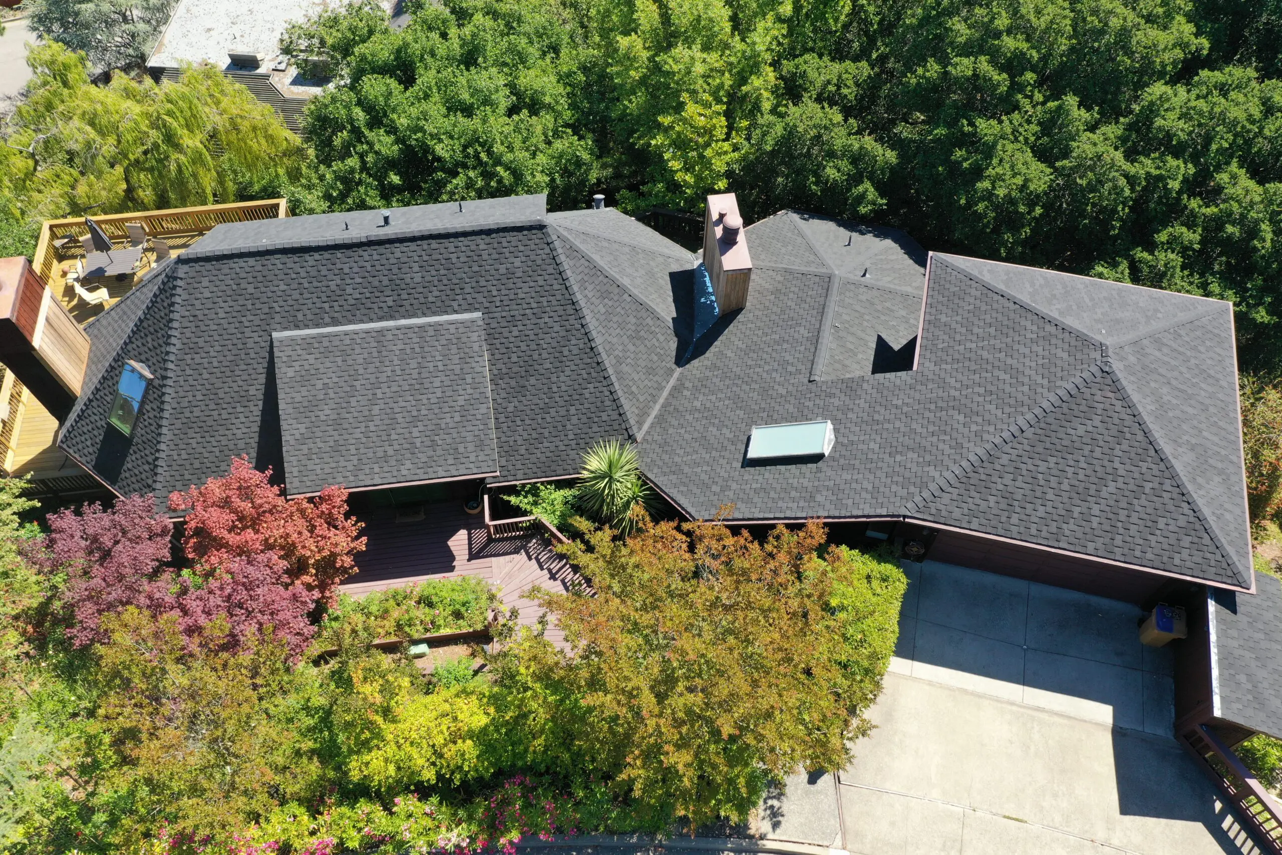 Reroofing of San Rafael, CA residence with GAF Grand Sequoia Shingles.